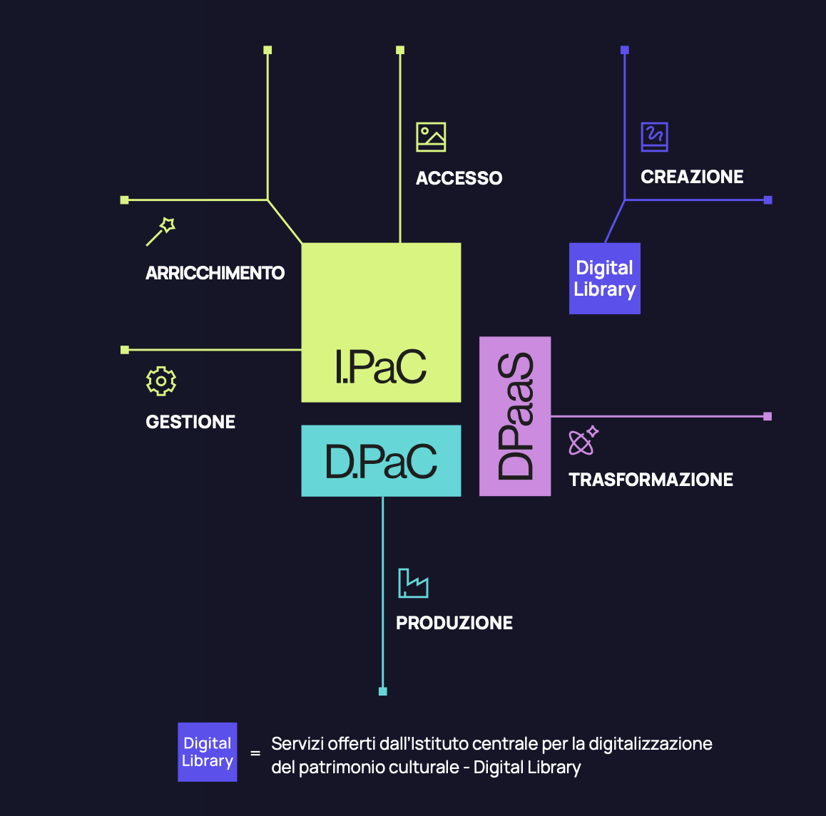 L’infrastruttura I.PaC permette di integrare le risorse digitali in un unico spazio dati nazionale, che ne potenzia la piena valorizzazione attraverso l’arricchimento con nuove informazioni e collegamenti.